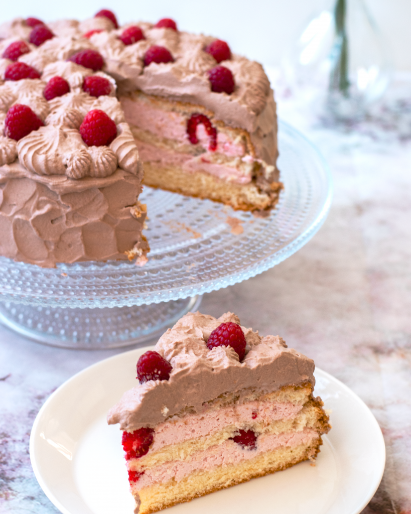 En härlig hallontårta med vit tårtbotten fylld med hallonmousse och färska hallon som spacklas och spritsas med en god chokladgrädde.