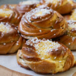 - Pensla de nygräddade bullarna direkt med sockerlag och strö över pärlsocker.