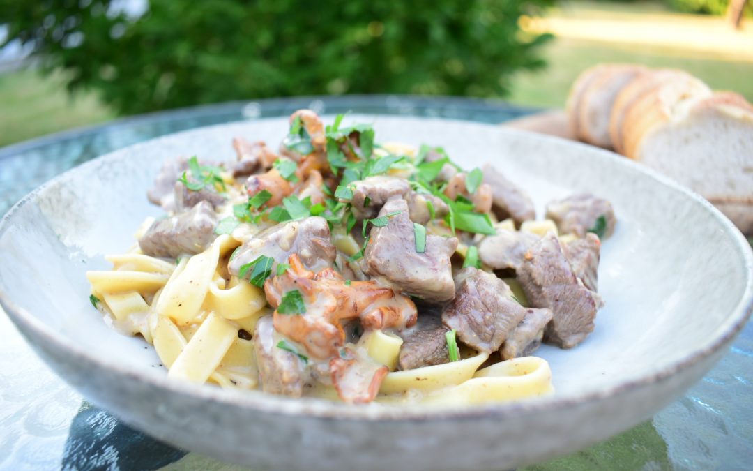 Skär köttet i mindre bitar. Skär eventuellt kantarellerna i mindre bitar. Skala och hacka lök och vitlök. Hetta upp en panna med smör och bryn köttet i omgångar och ställ åt sidan. Fräs sedan löken i smör i någon minut, tillsätt sedan vitlöken och chiliflakesen och fräs ytterligare 1 minut. Pudra över mjöl och bryn hastigt. Häll i grädde, vatten, oxfond och soja. Koka upp, sänk värmen och låt såsen sjuda under lock i ca 5 minuter. Smaka av med salt och peppar. Lägg i köttet och persiljan i såsen och låt såsen puttra i 5 minuter. Blanda sedan ner pastan i såsen. Servera pastan med riven parmesan, balsamico och gärna en bit bröd.