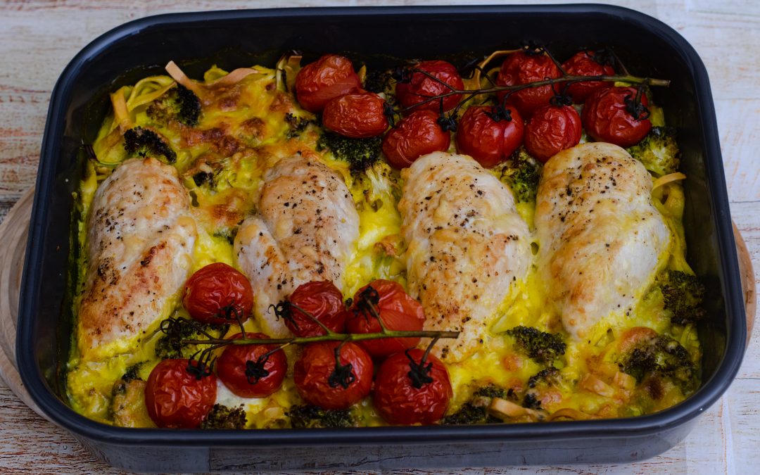 Lägg pastan i en ugnssäker form. Salta och peppra kycklingfiléerna. Hetta upp en panna med olja/smör och bryn kycklingfiléerna. Lägg kycklingfiléerna på pastan. Fördela broccolin i formen. Häll grädde, vatten, curry och fond i en kastrull. Koka upp såsen och smaka av med salt och peppar. Häll såsen över pastan och kycklingen. Fördela över mozzarellan och strö över riven ost. Ställ formen in i ugnen i ca 30 minuter. Efter 15 minuter lägg på tomaterna.