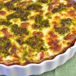 - Häll äggstanningen över pajen och toppa pajen med pesto.